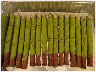 These are somewhat disturbing, yet delicious and super simple to make. Just place the chocolate in the microwave until melted, then add the food coloring in to make it the right color, if necessary. Stir the chocolate until it’s a solid color. Dip a pretzel rod in the chocolate, then use the toothpick to add “knuckles” and add a sliced almond for the “fingernail.” These might not be for the squeamish, but these are sure to be a hit at any Halloween party.